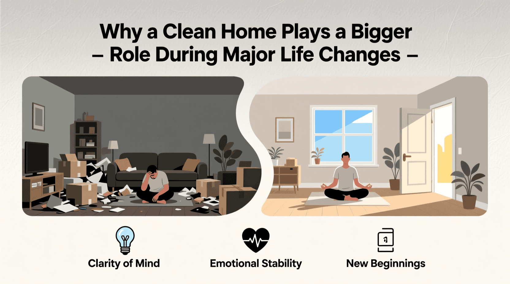 Major life changes affect both physical and emotional health. Clean homes support emotional balance by reducing negative emotions and creating calm surroundings. They help people stay organised, focused, and grounded.
